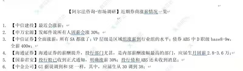 其中显示,中信建投近期涨薪、申万宏源所有人固定薪水涨30%,中信证券全面涨薪,而海通证券的投行部门加薪最多,应届生的固定薪水最高能达到3.6万!国泰君安的投行明确涨薪30%,中金公司的GI部门会涨到跟SE部门一样。