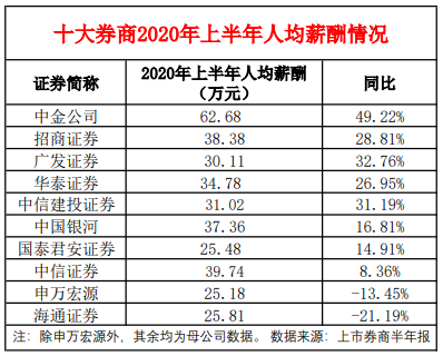 海通证券、国泰君安和申万宏源上半年人均薪酬则均超过了25万元。