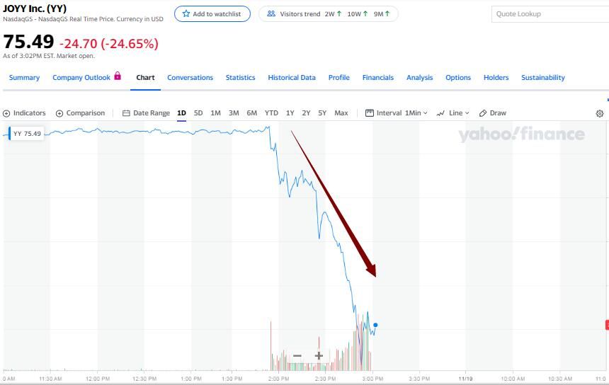 Block表态后,欢聚时代股价瞬间跳水,不到十分钟时间,日内跌幅从2.5%左右迅速扩大到10%以上,此后跌幅进一步扩大,跌幅超过20%。