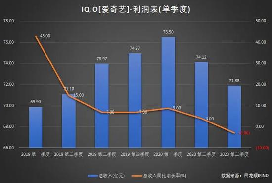 数据显示,受在线广告与内容分发业务影响,爱奇艺三季报实现营业收入72亿元,同比、环比均出现了3%的下滑。这也是公司自2018年上市以来,营收增速首次出现负增长。