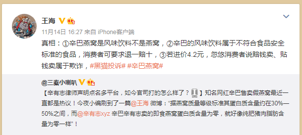 14日,王海在个人自媒体中称,真相是辛巴燕窝是风味饮料不是燕窝;辛巴的风味饮料属于不符合食品安全标准的食品,消费者可要求退一赔十;若进价4.2元,忽悠消费者说赔钱卖、贴钱卖属于欺诈。