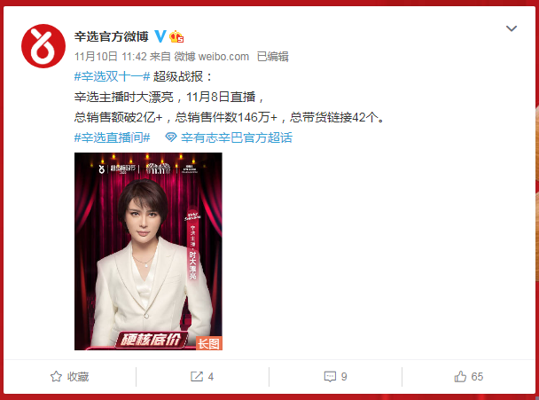 根据11月10日该公司官微发布的数据:卷入销售该燕窝的辛选主播时大漂亮,在11月8日直播中所有商品总销售额破了2亿元。