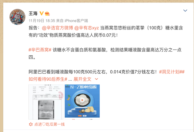 王海说:经过检测,@辛选官方微博@辛有志xyz当燕窝忽悠粉丝的风味饮料就是糖水。据检测结果,该产品蔗糖含量4.8%,而成分表里碳水化合物为5%,确认该产品就是糖水。