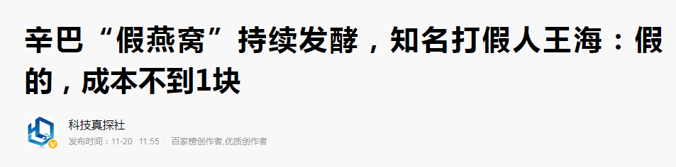 日前,知名打假人王海怒曝辛巴“双11”期间,在天猫平台直播时所售的燕窝竟是赤裸裸的假货。
