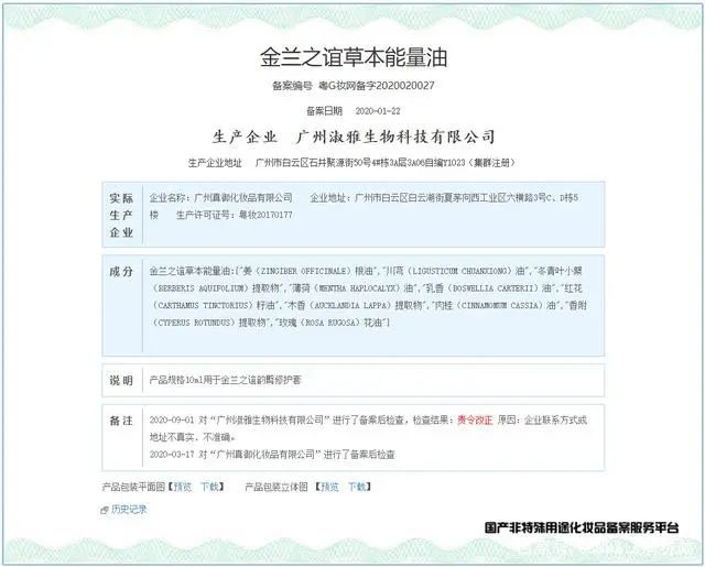 例如“MRSIMBA星空银河19色眼影盘”,其在淘宝平台公开的批准文号,在国药监局平台查询对应的产品却是“金兰之谊草本能量油”,且备案后检查结果显示“责令整改”状态。