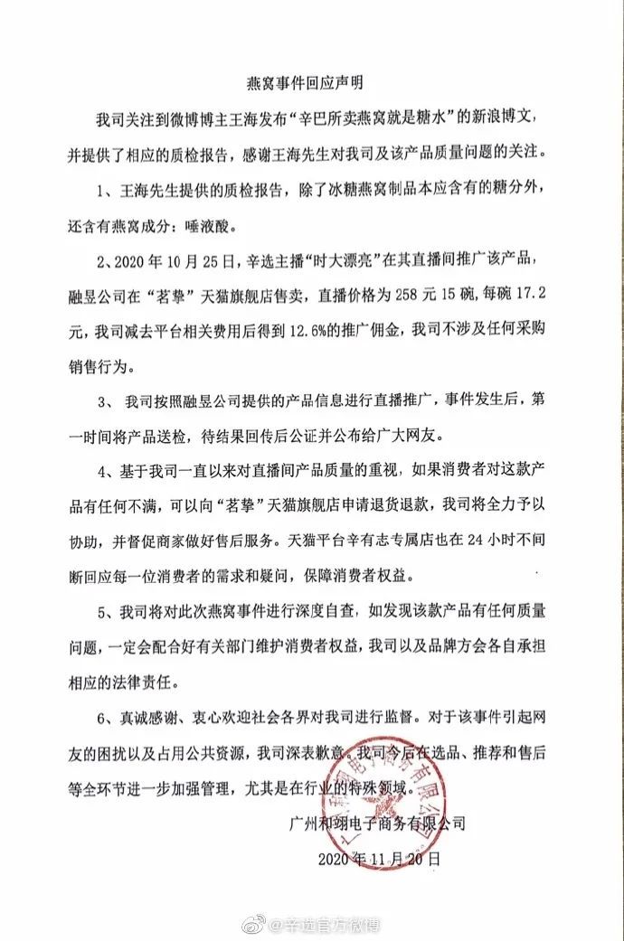 很快,迫于压力的辛巴旗下的公司回应了。