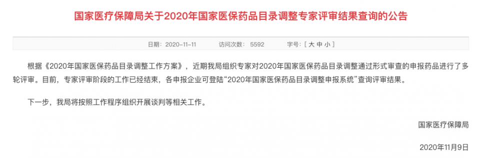 11月11日,国家医疗保障局官网发布《关于2020年国家医保药品目录调整专家评审结果查询的公告》(简称《公告》),提示专家评审阶段的工作结束,竞价谈判工作即将按照程序组织开展。