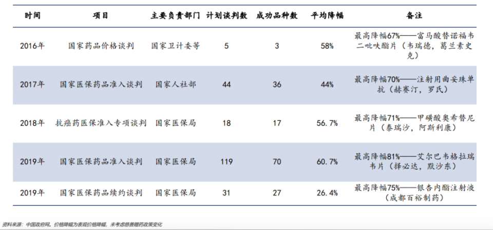2019年11月,国家医保局表示参与谈判的150个药品中,97个药品谈判成功。其中70个为新增药品,平均降幅为60.7%;27个为续约品种,价格平均降幅为26.4%。