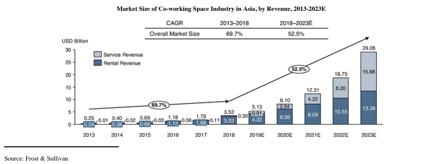我国共享办公的市场有多大?在未出现疫情的情况下,Frost&Sullivan数据显示,包括租赁收入和服务收入在内的中国共享办公空间市场规模从2013年的11.7亿元增加到2018年的174.1亿元,年复合增长率为71.7%,预计到2023年进一步增至1322.8亿元,年复合增长率为50%。