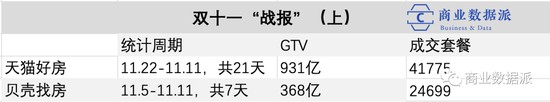 刚过不久的“双十一”,双方借助这一大促时间点,集中推广了新房交易。从战报来看,天猫好房通过与302家开发商的合作,进入了236个城市,GTV超过931亿元,对于天猫好房这一公布仅两月的业务线而言这无疑是喜报,背靠阿里,让天猫好房天生具备较强的行业动员能力。相比之下,贝壳找房则仅宣称与百强房企中的九成发起合作,GTV不到368亿元。