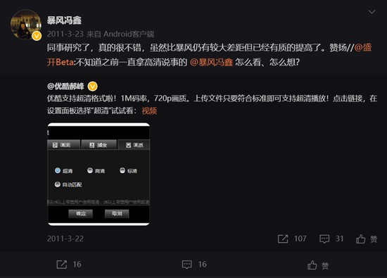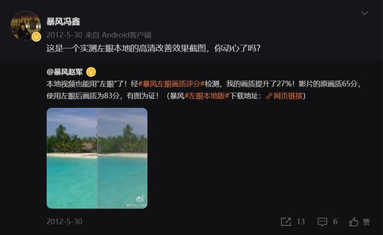 冯鑫乘胜追击,开发了暴风影音的SHD高清专利技术,并以此为基础,最早创造了在1M带宽下点播720P高清、2M带宽下点播1020P超清的观看效果,牢牢坐稳了传统播放器的龙头地位。