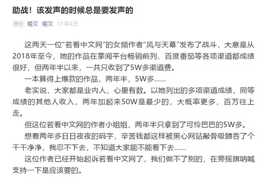 资深写手姬叉发文痛斥了渠道层层剥削的现象。一位作者从2018年至今,作品在各渠道的成绩都很好,却在子站、某中文网、某平台和其他授权渠道的层层分账下,仅收入5万多元。