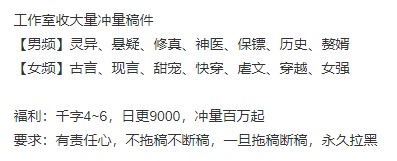 “工作室收大量冲量稿件,修真、赘婿、神医、快穿、宫斗、古言……6:4分成+签约,全勤、完结奖励+保底,日更1万,千3-千5。”