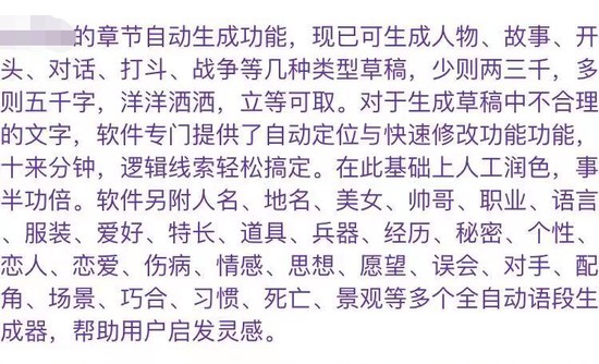 在某宝搜索写作神器之后,文学的世界原来这才朝我展开。各类词库是最低级的,环境、人物描写的大数据模板也不太稀奇,最惊人的是这些程序都宣称可以自动生成章节,“轻轻一点,就可以生成完整梗概”。