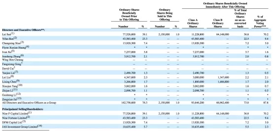 根据招股书披露,IPO前,创始人兼CEO孙雷为最大股东,通过Nine F Capital Limited直接持有39.1%的普通股,法人任一帆通过Nine Fortune Limited持股23.3%。NineF Capital Limited与Nine Fortune Limited分别为二人在境外设置的信托项目。唯猎资本创始合伙人肖常兴,则通过DFM Capital Ltd.持股7.4%,为第三大股东。任一帆和肖常兴二人并非集团高管。