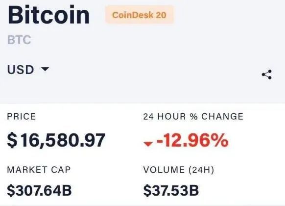 11月26日,比特币价格高位急跌,盘中跌破17000美元。截至发稿,根据比特币新闻资源网Coindesk报价显示,比特币价格约为16580美元,24小时跌幅达12.96%,24小时内比特币成交额为375.3亿美元。