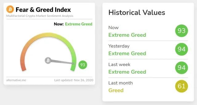 从指标可看出,整个11月比特币交易的“恐惧与贪婪”指数一直处于历史高位,直观地显示出这类资产投资者正处于“极度贪婪”的状态。