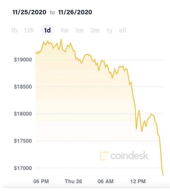 大量获利盘集中抛售,进一步挤兑使用高杠杆的合约,又因为适逢感恩节,许多散户没有来得及追加保证金而被强平,引发比特币进一步下挫。