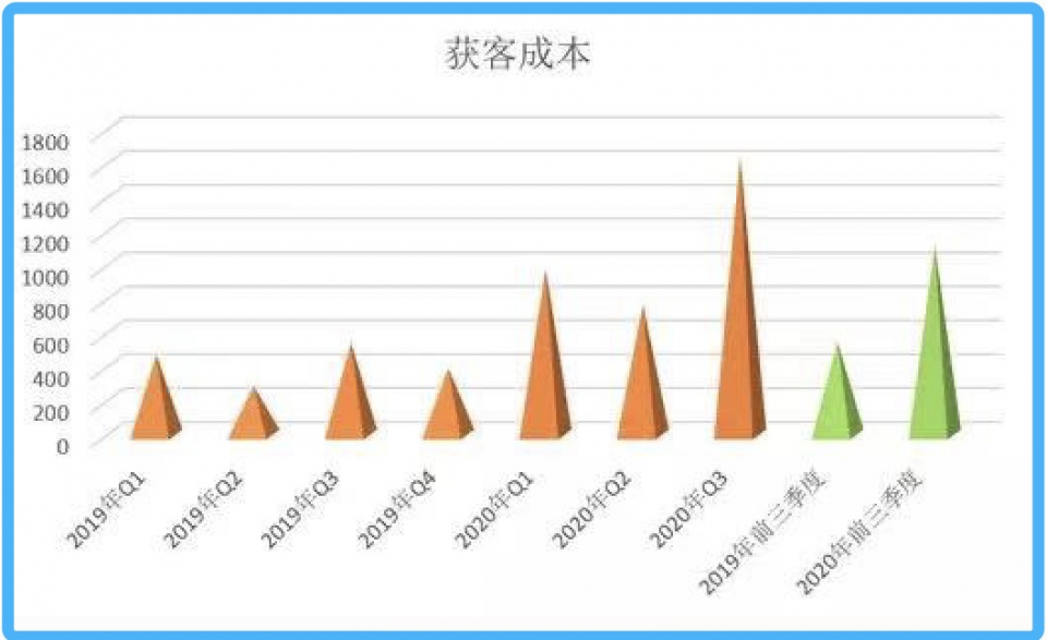 随着加大营销投入,跟谁学获客成本在快速增加。据新浪财经,按照跟谁学的公式(销售费用/正价课付费总人次)计算,其获客成本已由2019年前三季度的549多元/人增加至2020年前三季度的1117元/人。