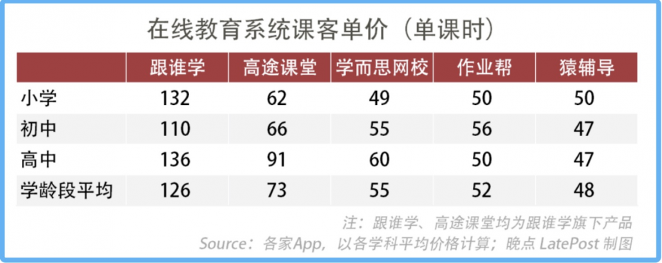 《晚点LatePost》曾在一篇报道中统计、对比过跟谁学(包括高途)与同行的课程价格,结论是跟谁学名师课价格在同行中处于领先位置。