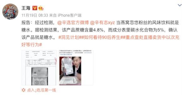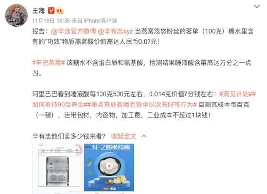 11月19日,王海其微博发布了中广测出具的检测报告,直指辛巴所售的即食燕窝产品“就是糖水”,且“该糖水不含蛋白质和氨基酸,检测结果唾液酸含量高达万分之一点四”,而市场上每100g含量的唾液酸售价是500元,0.014g价值也只有7分钱左右,加上包材、内容物、加工费、工业成本不超过1块钱。