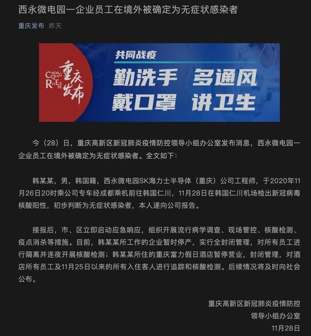 据重庆发布,重庆高新区新冠肺炎疫情防控领导小组办公室11月28日通报,重庆西永微电园一企业员工在境外被确定为无症状感染者。