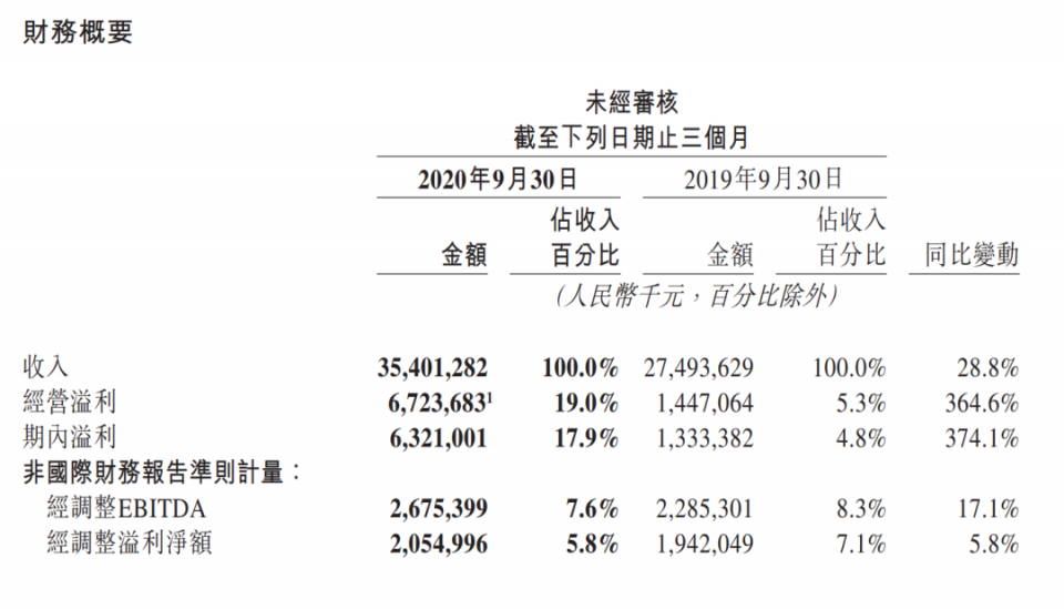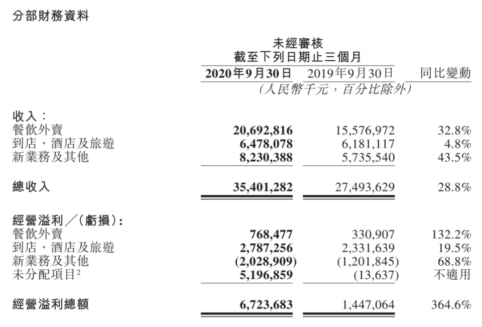 餐饮外卖业务的经营溢利由2019年第三季度的人民币330.9百万元增加至2020年第三季度的人民币768.5百万元,而经营利润率则由2.1%升至3.7%。