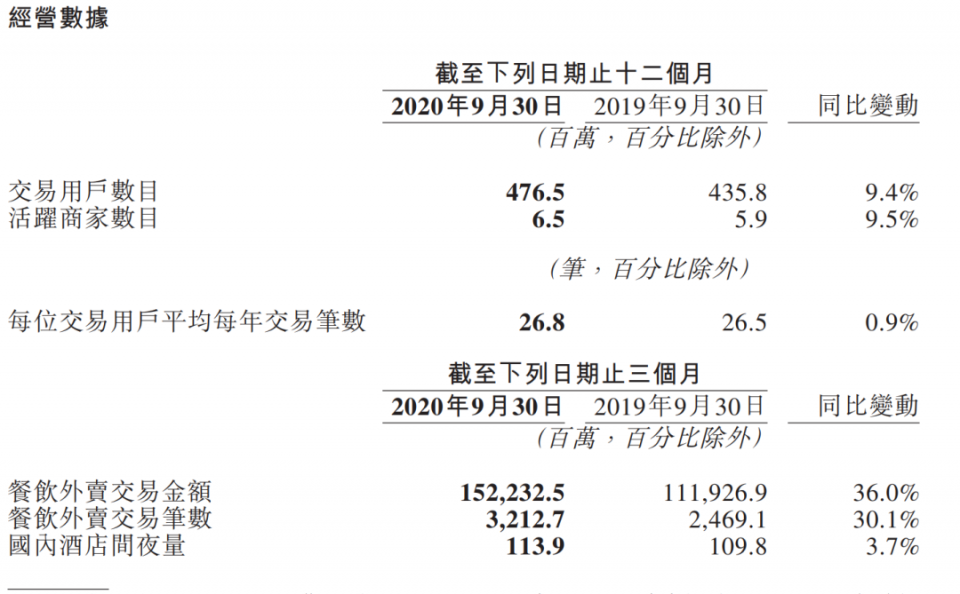 餐饮外卖业务变现率由2019年同期的13.9%降至2020年第三季度的13.6%。因此,2020年第三季度,餐饮外卖收入同比增长32.8%至人民币207亿元。