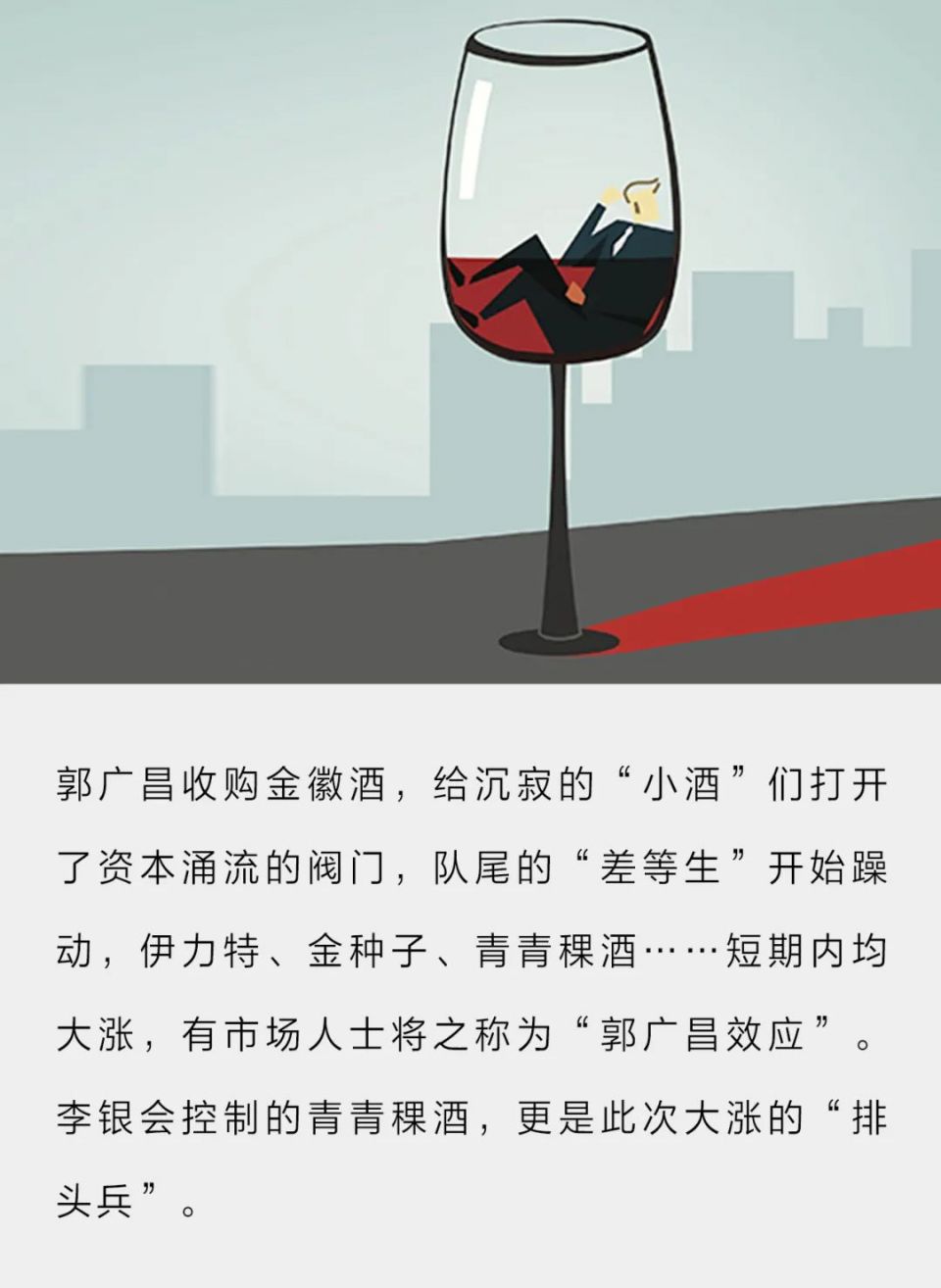 郭广昌收购金徽酒,仿佛给沉寂的“小酒”们打开了资本涌流的阀门,队尾的“差等生”开始躁动,伊力特、金种子、青青稞酒……短期内均大涨,有市场人士将之称为“郭广昌效应”。