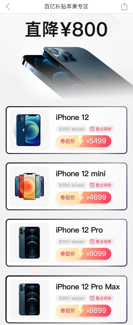▲iPhone12全系登录百亿补贴苹果专场页面,带来全网最低价