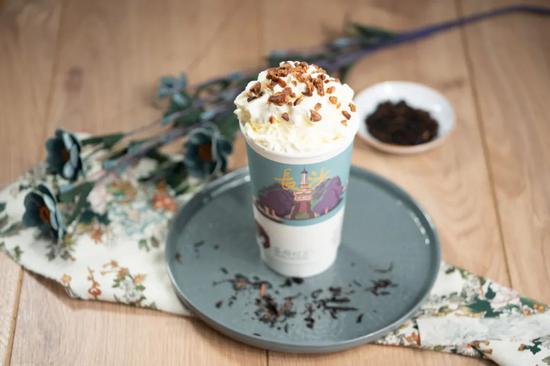 首先是喝法的独特,茶颜悦色主打新中式鲜茶。在2013年新式茶饮尚不算流行的时候它就已经开始采用鲜茶加鲜奶的制作模式,顶上还会盖上一层星冰乐一样的搅打奶油,再于奶油之上撒上碧根果、提子干等坚果或果干,口感清爽不腻。饮料装在纸杯中售卖,但没有盖子,喝的时候也不用吸管而是直接对嘴喝,能够大口将奶油吃进嘴里。