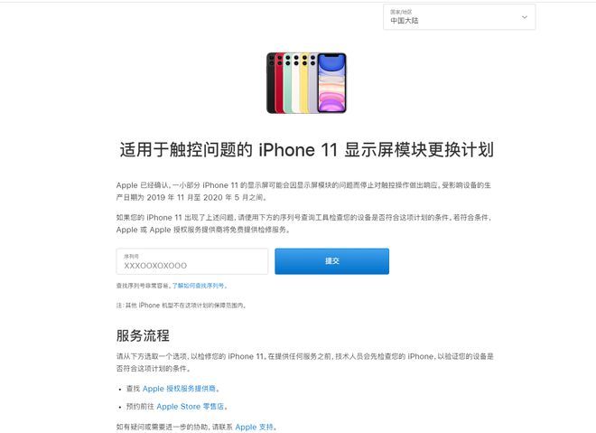 用户首先需要到官网查询是否属于受影响的用户,这一步只需要手机序列号即可。(点开苹果官网首页导航条“技术支持”——>相关页面下端点开"Apple 服务计划"中的"适用于触控问题的iPhone 11显示屏模块更换计划")