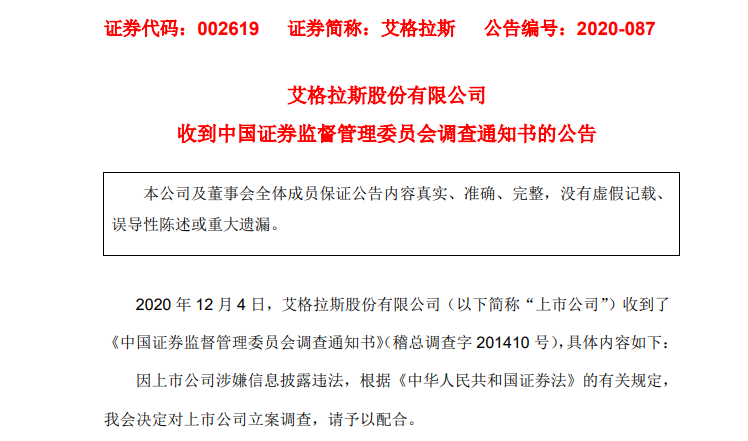 关于本次被立案调查的原因,艾格拉斯描述较为隐晦,仅表示涉嫌信息披露违法。