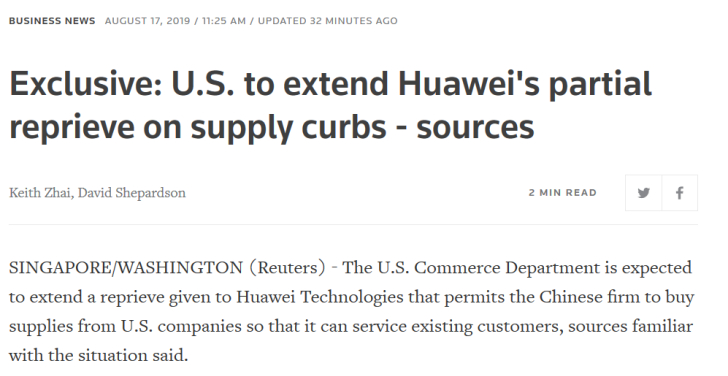 不过对于这一消息美国商务部拒绝做出评价。美国商务部长威尔伯•罗斯(Wilbur Ross)本周早些时候在接受CNBC电视台采访时表示,现有许可证的有效期将在周一截止。当被问及是否会延期时,他说:“周一我会很高兴告诉你最新的消息。”