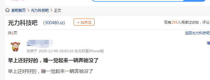 闪崩发生后,光力科技的股东们也被一下子打懵了,有投资者表示,“发生什么事了?这样猛跌”?也有人表示,有可能遇到“杀猪盘”。更有投资者表示,早上还好好的,睡一觉起来一辆奔驰没有了。