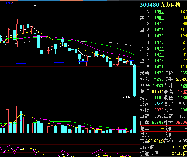 9日开盘,小幅低开的光力科技一直都是窄幅整理,10点20分左右,其股价开始放量走低,跌幅逐渐扩大,接近当日午间收盘时,其跌幅扩大至3%。而午后开盘,股价更是大幅跳水,不到20分钟股价跌幅进一步扩大至10%以上,休整2分钟后,其股价又开始一波跳水,这期间,成交量也是逐步放大。截至当日收盘,光力科技跌幅定格在14.49%。