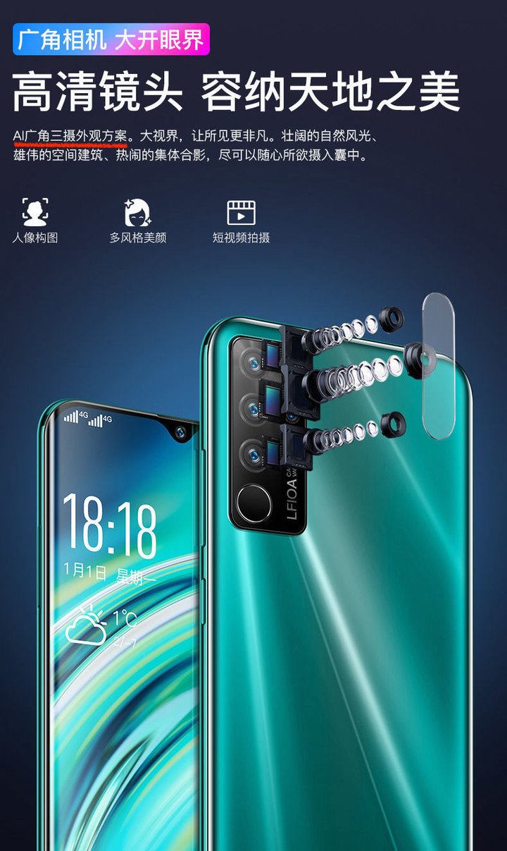 令我感到气愤的是,不少品牌的山寨机在商品详情页,给每颗摄像头都标上了像素或者焦段。但实际上只有一颗摄像头可以工作。