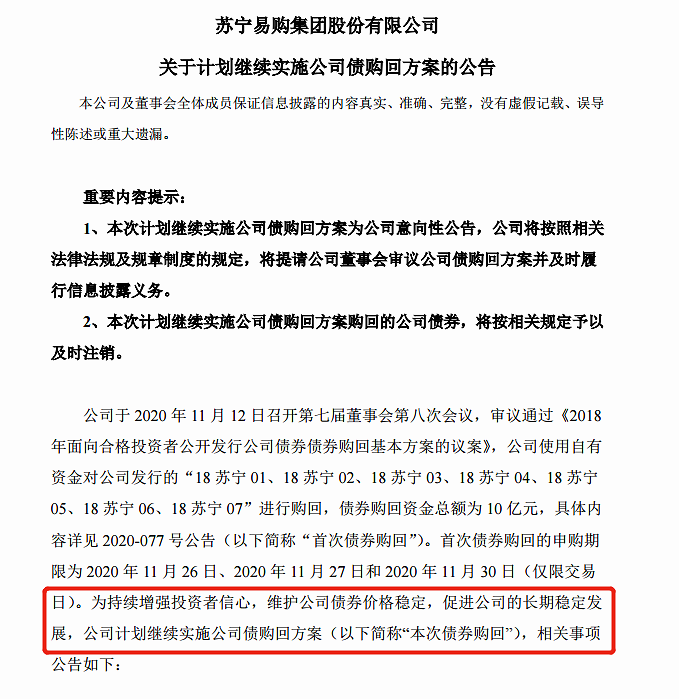 11月23日,苏宁易购再发晚间公告,表示为持续增强投资者信心,维护公司债券价格稳定,计划继续使用自有资金对公司债券进行购回。