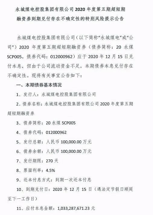 11月10日,河南省国企永城煤电控股集团有限公司旗下债券“20永煤SCP003”到期未能兑付,发生实质性违约。