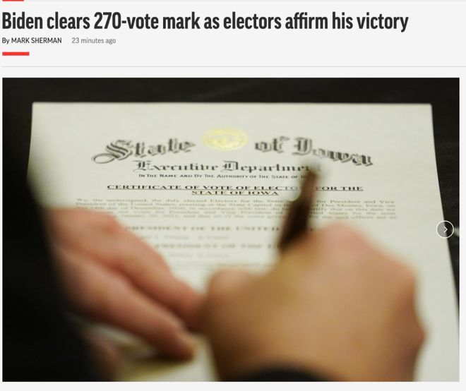 在获得了加州的55张选举人票后,拜登获得超过入主白宫所需的270张选举人票,选举人团至此确认他当选为美国下一届总统。