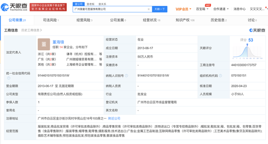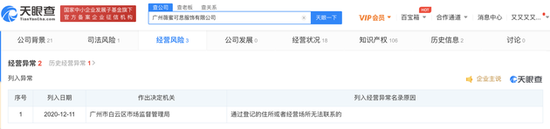 商业 登记住所无法联系:薇娅名下服饰公司被列入经营异常名单 2020-12-15 11:37:47 分享 来源:新浪科技12月15日上午消息,天眼查App显示,近日,广州薇蜜可思服饰有限公司被列入经营异常。列入日期为2020年12月11日,作出决定机关为广州市白云区市场监督管理局,列入经营异常名录原因为通过登记的住所或者经营场所无法联系的。广州薇蜜可思服饰有限公司成立于 2013年6月17日,注册资本为50万人民币,法定代表人为薇娅丈夫董海锋,公司经营范围包括服装批发;商品批发贸易;商品零售贸易;货物进出口等。该公司由董海锋持股55%,由黄薇(薇娅)持股45%。