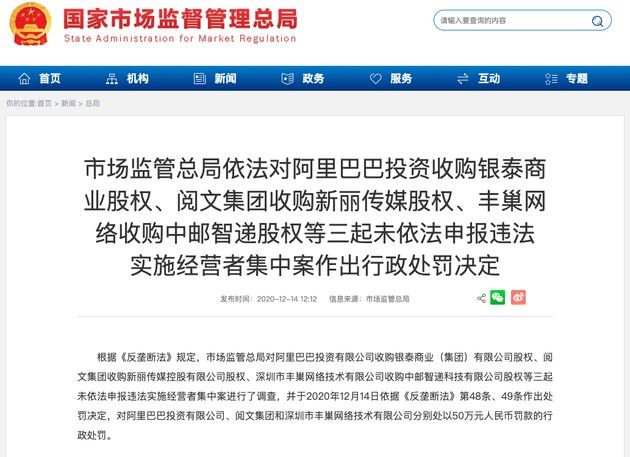 炣燃科技12月15日讯(安迪)昨日(12月14日),根据《反垄断法》规定,市场监管总局对阿里巴巴投资有限公司收购银泰商业(集团)有限公司股权、阅文集团收购新丽传媒控股有限公司股权、深圳市丰巢网络技术有限公司收购中邮智递科技有限公司股权等三起未依法申报违法实施经营者集中案进行了调查,并于2020年12月14日依据《反垄断法》第四十八条、四十九条作出处罚决定,对阿里巴巴投资有限公司、阅文集团和深圳市丰巢网络技术有限公司分别处以50万元人民币罚款的行政处罚。