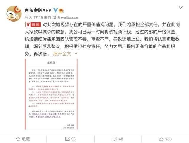 在一片骂声中,京东金融在今天发了微博道歉,并表示已将视频下线。