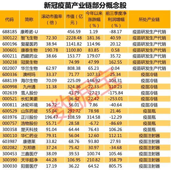 疫苗研发、生产、代销的概念龙头股,包括康希诺、智飞生物、复星医药、康泰生物、西藏药业、冠昊生物等;疫苗瓶的概念股包括正川股份、山东药玻等;疫苗冷链的概念股包括冰轮环境、海尔生物、澳柯玛等;注射器方面,概念股有华仁药业、康德莱、万邦德、三鑫医疗等。