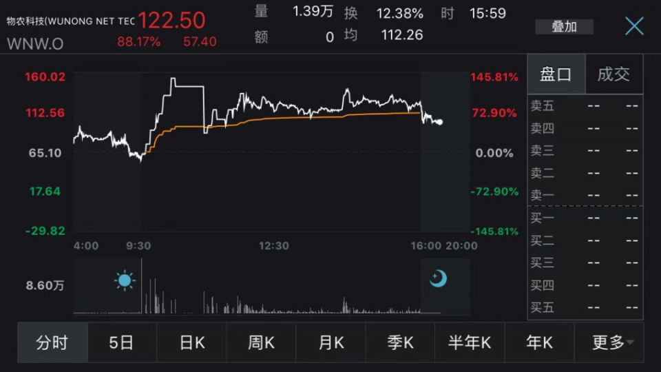 中概股物农网盘中8次触发熔断,一度攀升至160美元,截至收盘报122.50美元,涨幅88.17%。