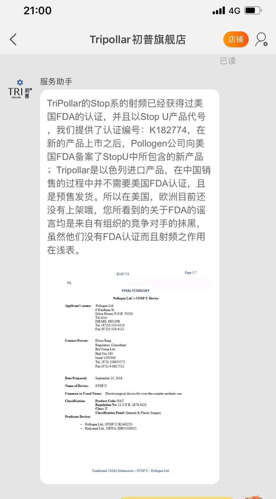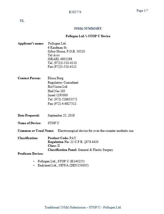 在天猫旗舰店提供的图片中,我们可以看到最下方是“Traditional 510(k) Submission—STOP U—Pollogen Ltd”字样,看起来非常专业,但事实上Submission只是备案,不是认证。这仅仅是STOP U这款产品在FDA官网上提交的资料,告诉FDA这款产品要上市了,但没有得到“认证”。至于传统的510K,更是没有多权威。