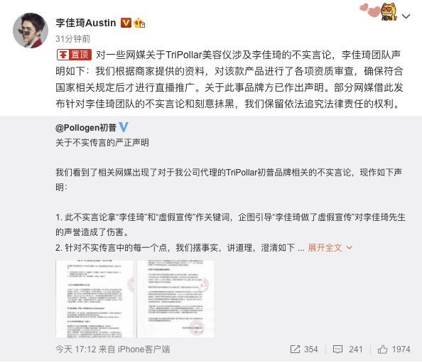 商业 李佳琦回应“美容仪涉嫌虚假宣传”:刻意抹黑 2020-12-20 08:54:46 分享 来源: 界面新闻@李佳琦Austin 微博消息,12月19日,李佳琦团队就网传其所售美容仪涉嫌虚假宣传发布声明称:“我们根据商家提供的资料,对该款产品进行了各项资质审查,确保符合国家相关规定后才进行直播推广。”李佳琦团队表示,关于此事品牌方已作出声明。部分网媒借此发布针对李佳琦团队的不实言论和刻意抹黑,我们保留依法追究法律责任的权利。