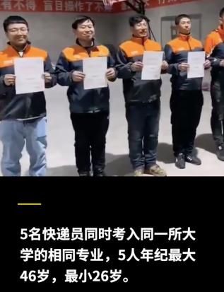 在黑龙江通河,一快递公司5名快递员同时考入同一所大学相同专业,最大46岁,最小26岁。