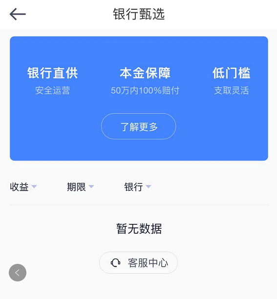 页面显示,滴滴金融的银行甄选一款产品都没有。滴滴金融称,目前滴滴理财已停止新增银行存款产品,新客已不能购买银行存款类产品。我们密切关注,坚决落实监管相关规范和要求,将严格按照监管部门的政策指引,有步骤、有秩序地调整存量用户,严格落实监管政策。