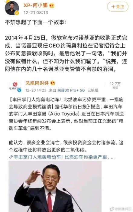 商业 怼完马斯克,何小鹏又回应丰田掌门人:想到诺基亚 2020-12-22 10:15:19 分享 来源:梨视频【#何小鹏回应丰田掌门人炮轰电动汽车# :想到诺基亚】12月21日,何小鹏对丰田章男认为“电动汽车被过度炒作“一事在微博上进行了评论:想到诺基亚。或许在何小鹏看来,丰田作为燃油车时代的霸主,如果不积极拥抱汽车行业的转变,丰田的未来也同样值得担忧。